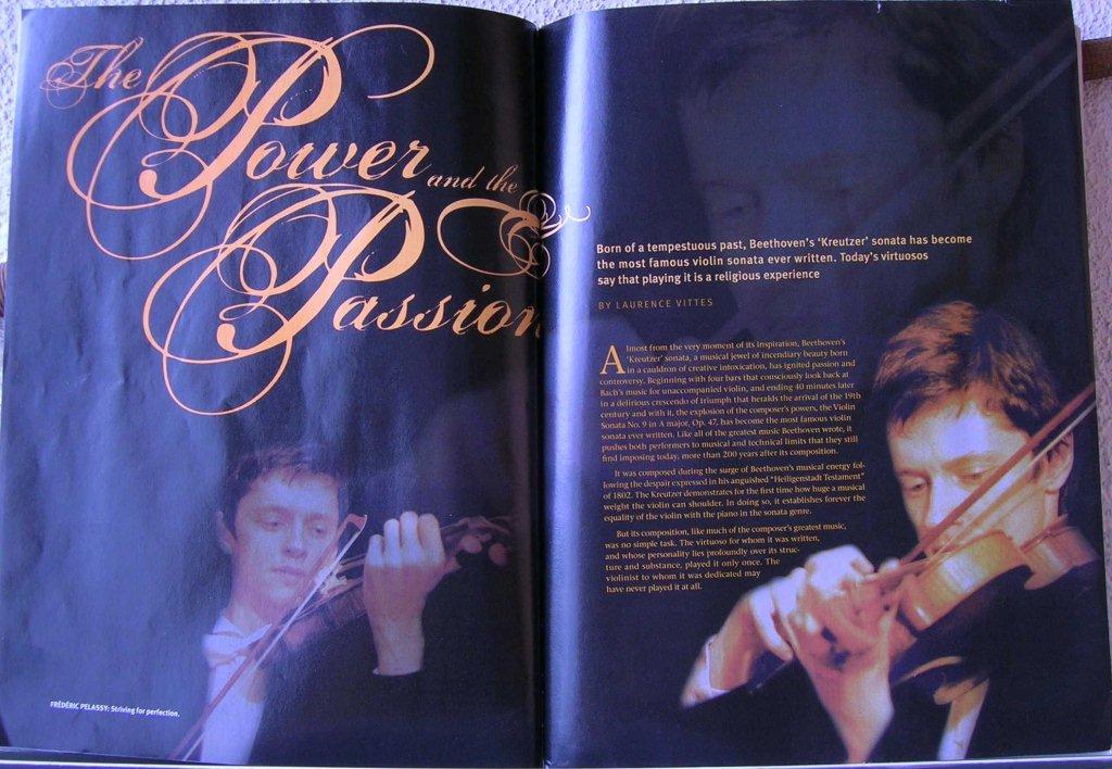 « TRIOMPHE POUR FREDERIC PELASSY. D’un geste rapide, le jeune virtuose cale son violon contre son cou, lève son archet et lance ses longues mains fines. Frédéric n’a pas de partition. Dans le public l’attention se creuse : le concerto en Ré Majeur pour violon de Beethoven prend toute sa puissance… On redécouvre la béatitude! »