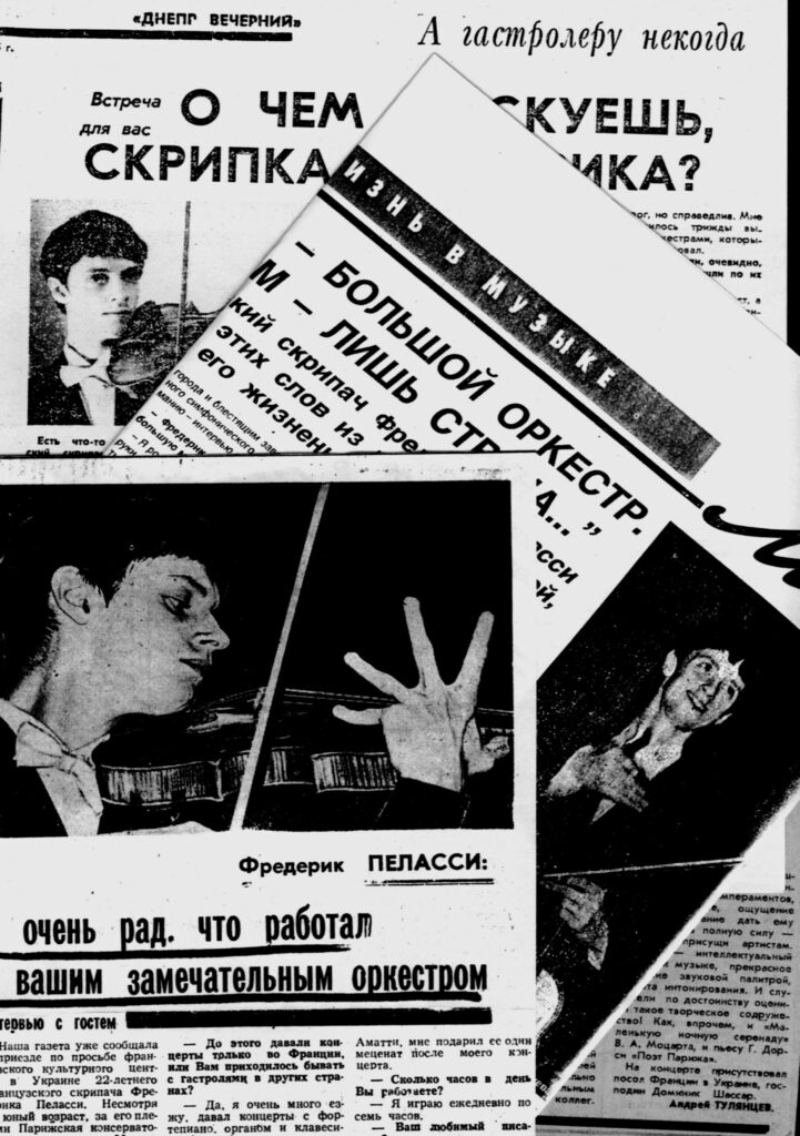 « UN VIOLONISTE DE GÉNIE À ACHKHABAD. Frédéric Pelassy revenait pour la troisième fois, avec un récital pour violon seul dans la grande salle… De son jeu incroyablement facile et libre, le virtuose a une fois de plus subjugué le public. Tout entier à son jeu, ne faisant qu’un avec son violon, il a offert à la salle de ces minutes de bonheur qui ne se retrouvent pas. Son interprétation brille à la fois par sa perfection et sa profondeur, il a le don de conférer à chaque note élévation et naturel en même temps – ces composantes mêmes du génie créatif. Il enseigne, littéralement, comment il faut comprendre et écouter la musique…. En écoutant les grandes œuvres ainsi interprétées on comprend effectivement: de même qu’il faut un prophète pour apporter au peuple la parole de dieu, de même il faut un musicien hors du commun pour manifester l’essence de la musique. »